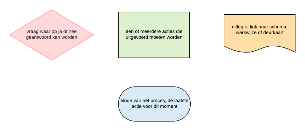 Een aantal procedures is eventueel vormgegeven middels een stroomschema. Hieronder is weergegeven wat de verschillende symbolen in deze schema’s betekenen.